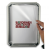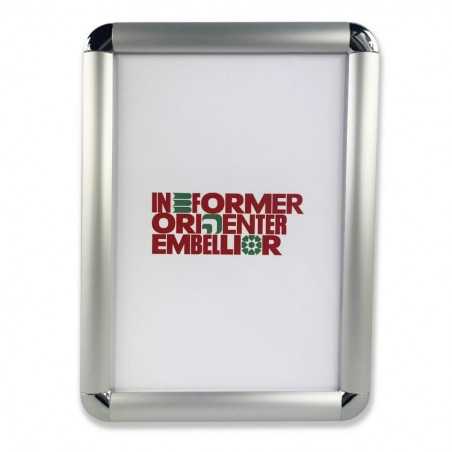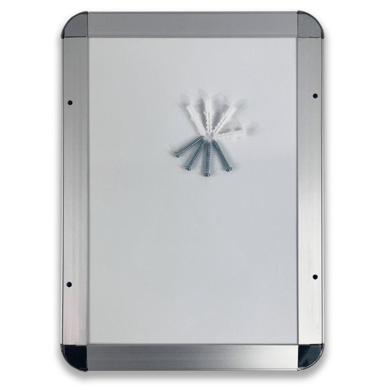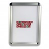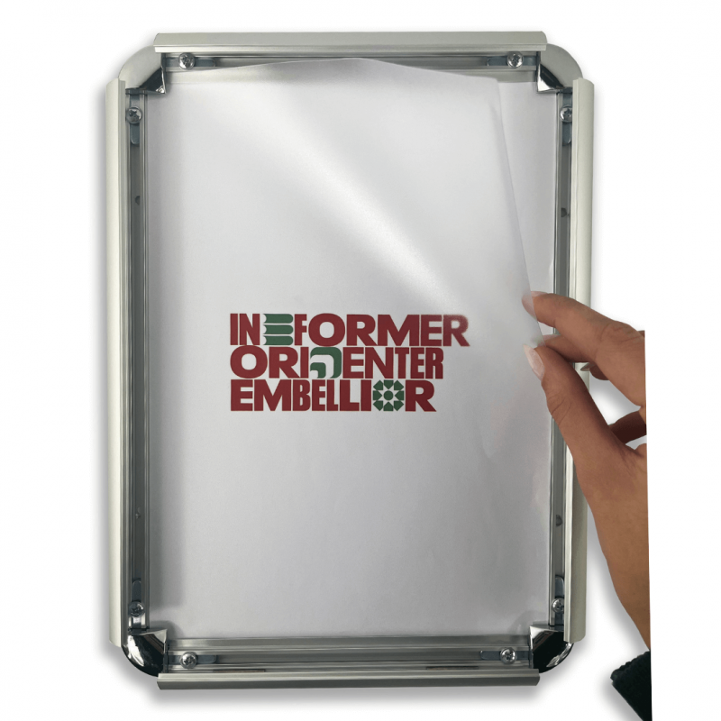 Systeme d'affichage composé de profils en aluminium avec coins arrondis chromés et d'une protection en polycabonate transparent anti-reflet.