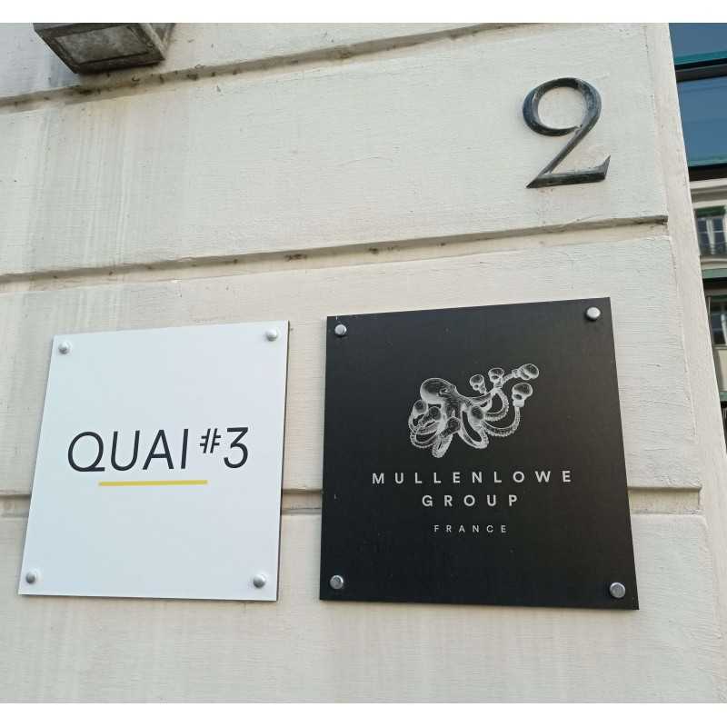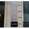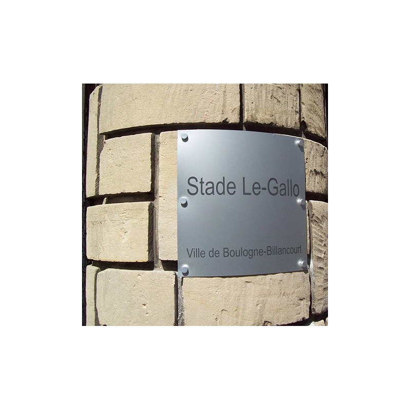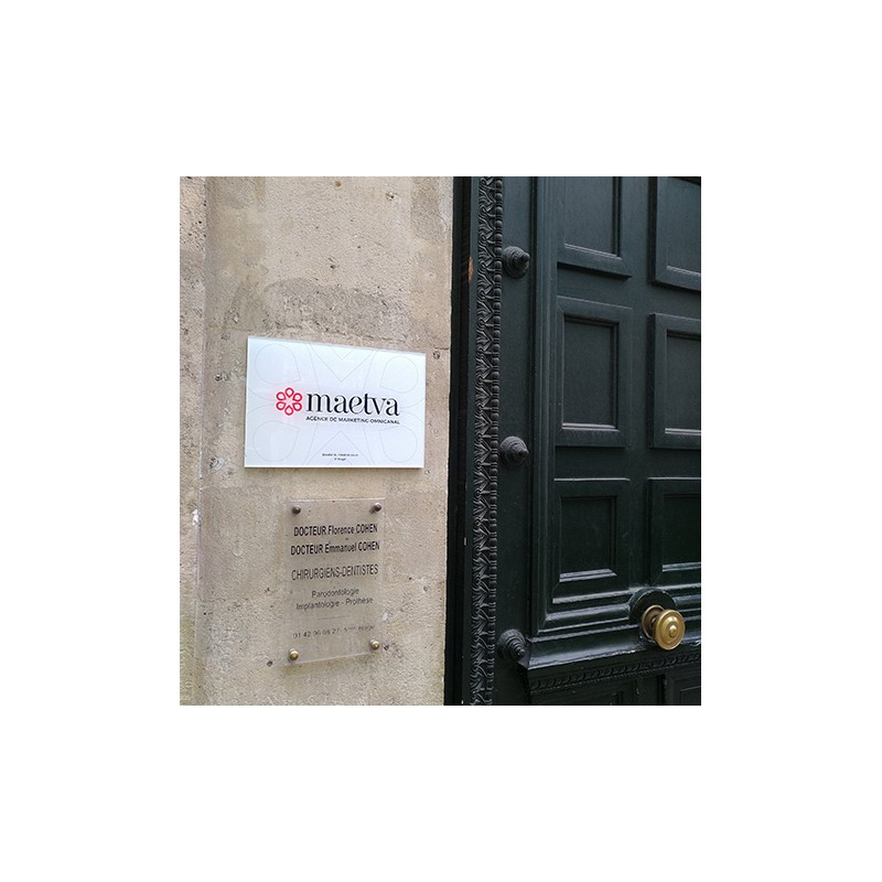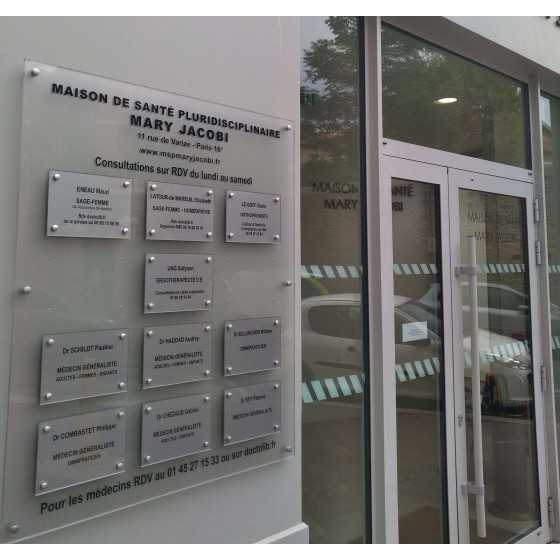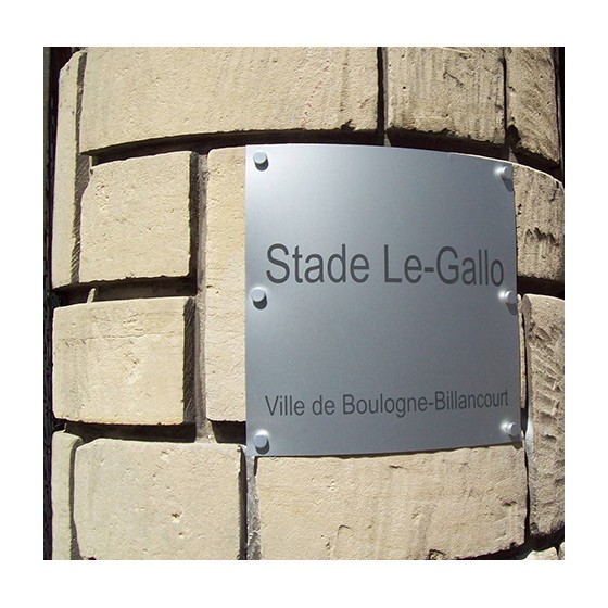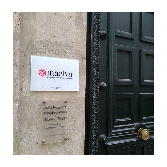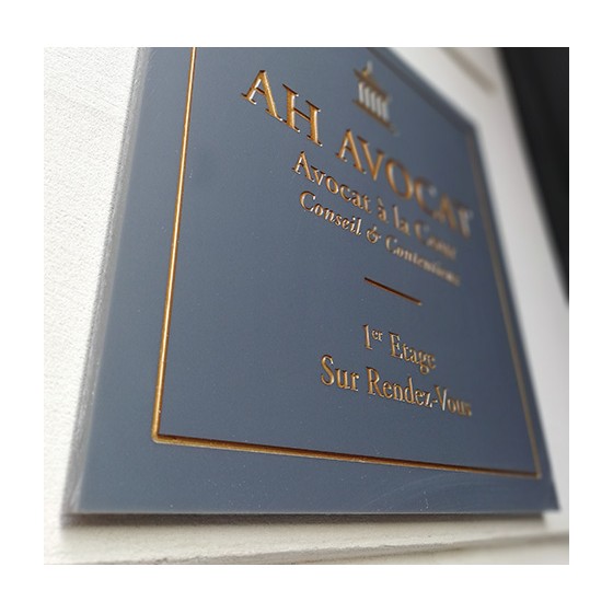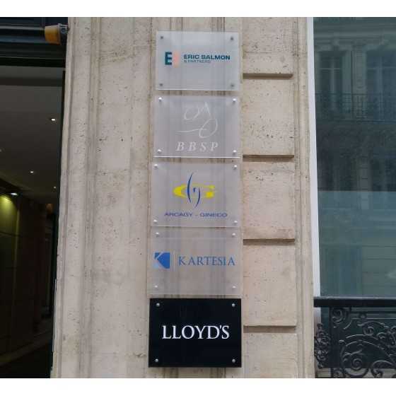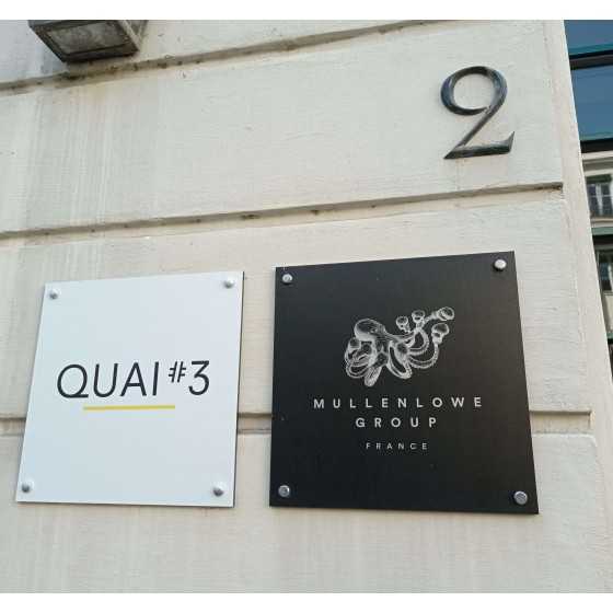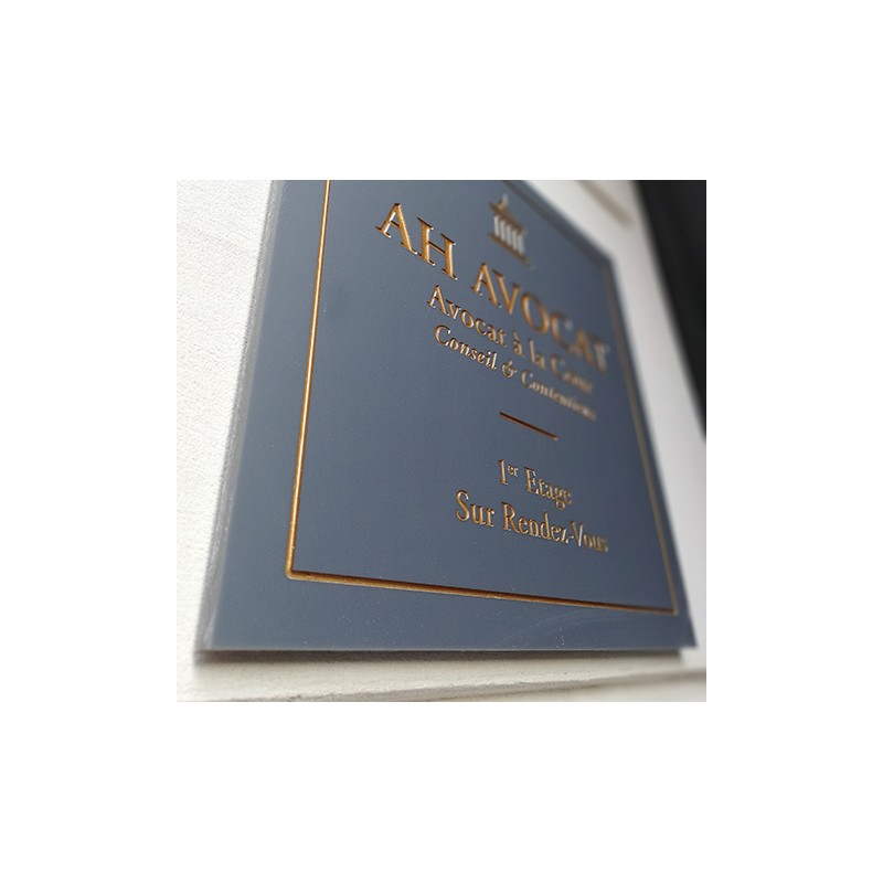 Diverses conceptions sont possibles, selon le matériau retenu: verre, plexiglas, PVC, Expolux, Dibond, laiton, marbre Impression haute qualité, gravure, lettres adhésives Découpe haute précision pour conception filaire Fixation par vissage (avec ou sans entretoises, avec ou sans cache-vis) ou collage Pose par nos équipes