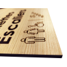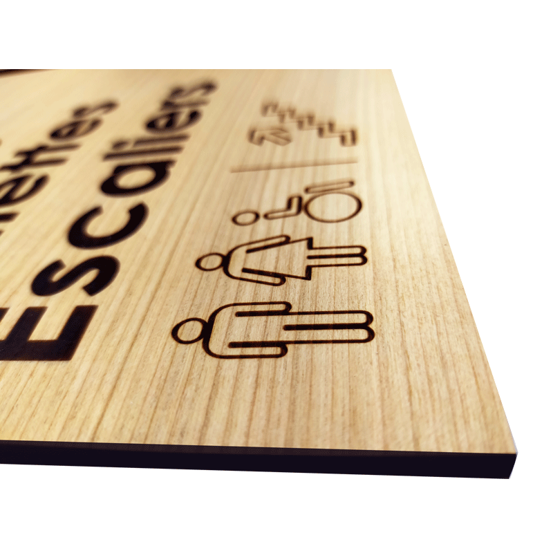 Gamme de produits de signalétique en bois, de dimensions et aux designs variés, utilisée pour informer ou décorer un lieu.