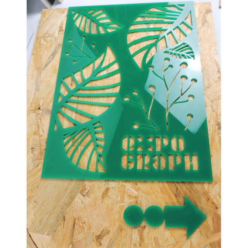 Gamme de produits de signalétique en bois sur mesure, combinée à du plexiglas (PMMA), aux dimensions et designs variés, utilisée pour informer ou décorer un lieu.