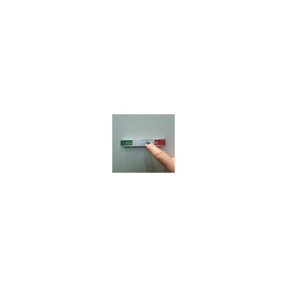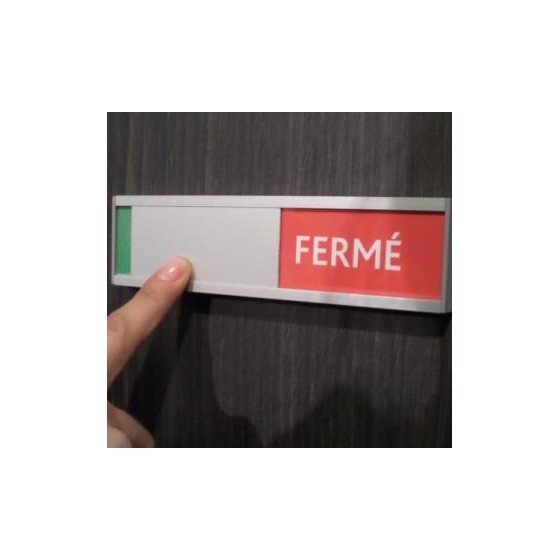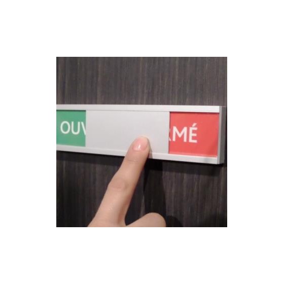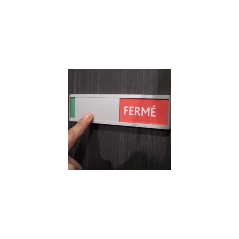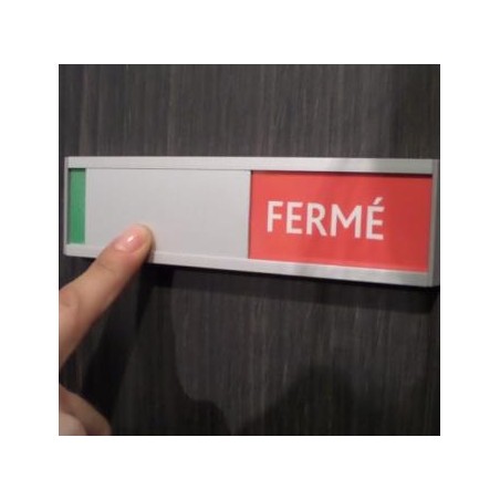 Plaque de porte en aluminium naturel avec systeme coulissant laissant apparaître un message "ouvert" ou "fermé"