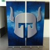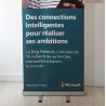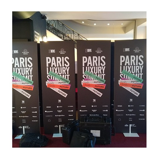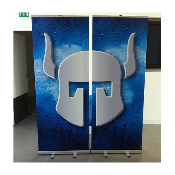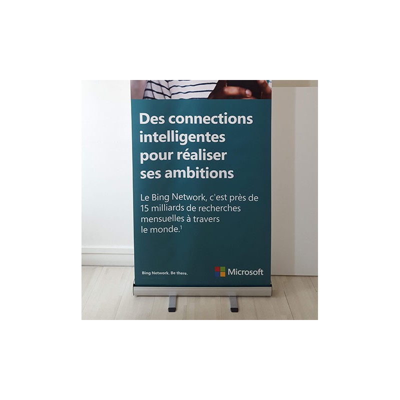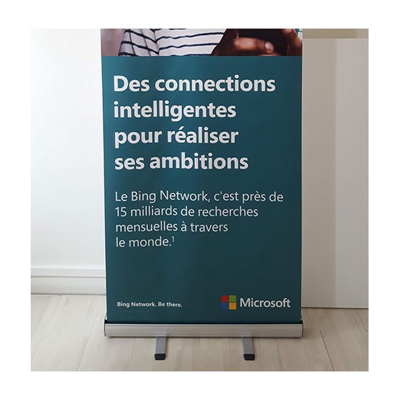 Visuel imprimé sur un support souple et fixé sur une structure permettant de l'enrouler et de le dérouler facilement.