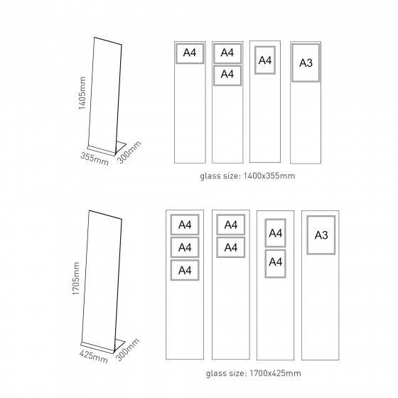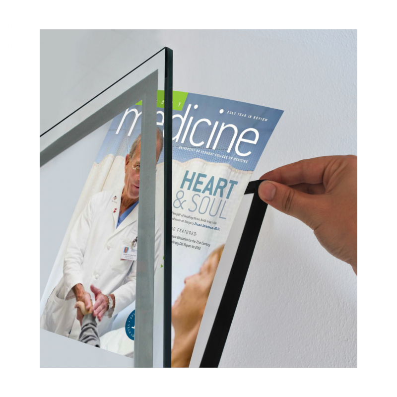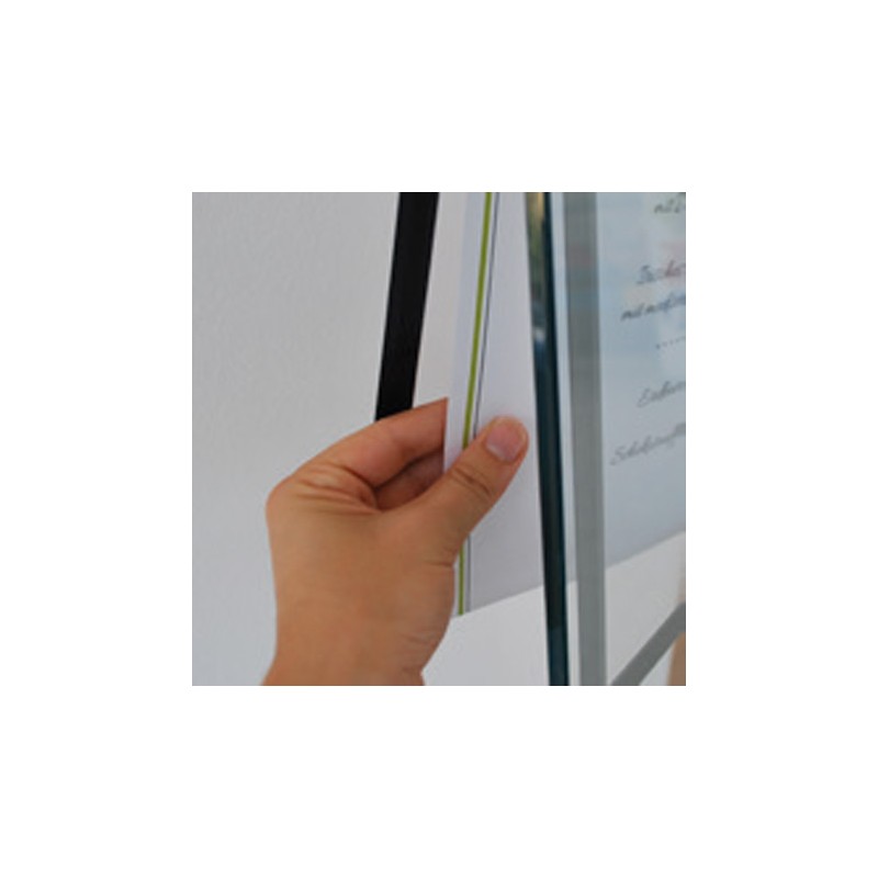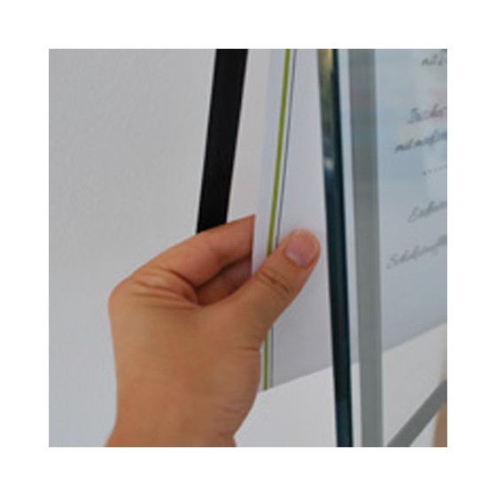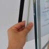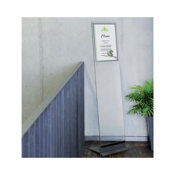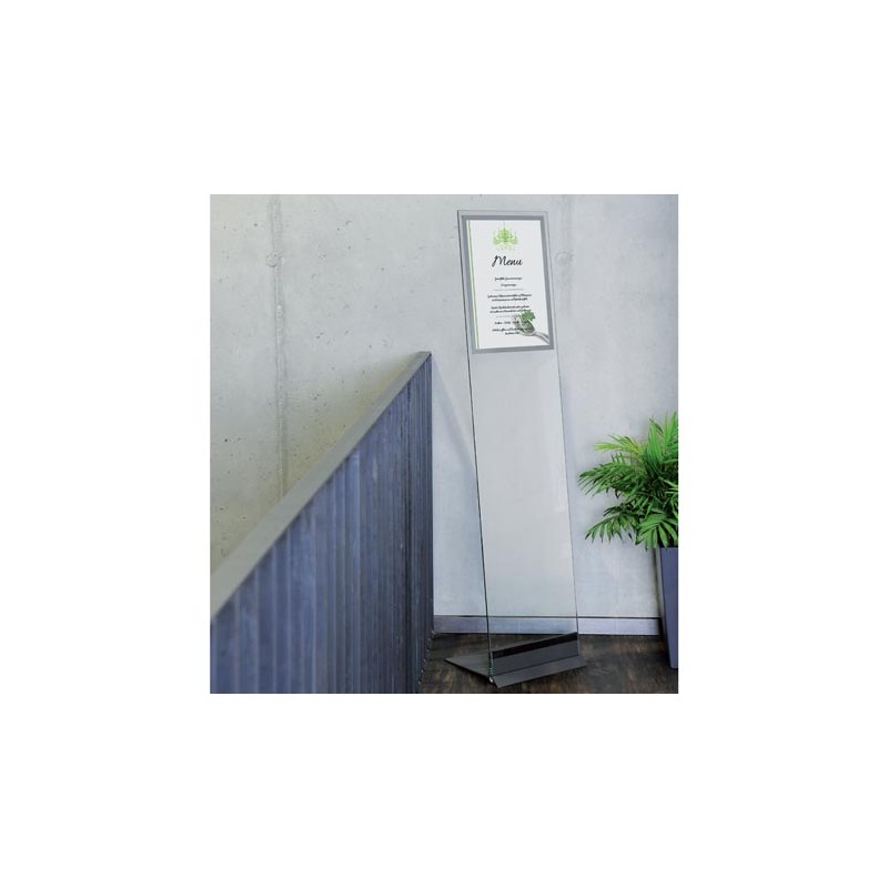 Porte-affiche composé d'une face en verre trempé posé sur une platine en métal peint époxy anthracite et d'un porte-affiche magnétique transparent.