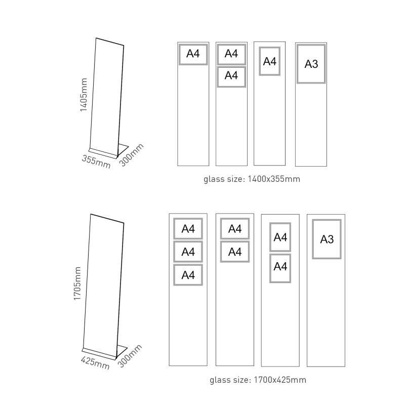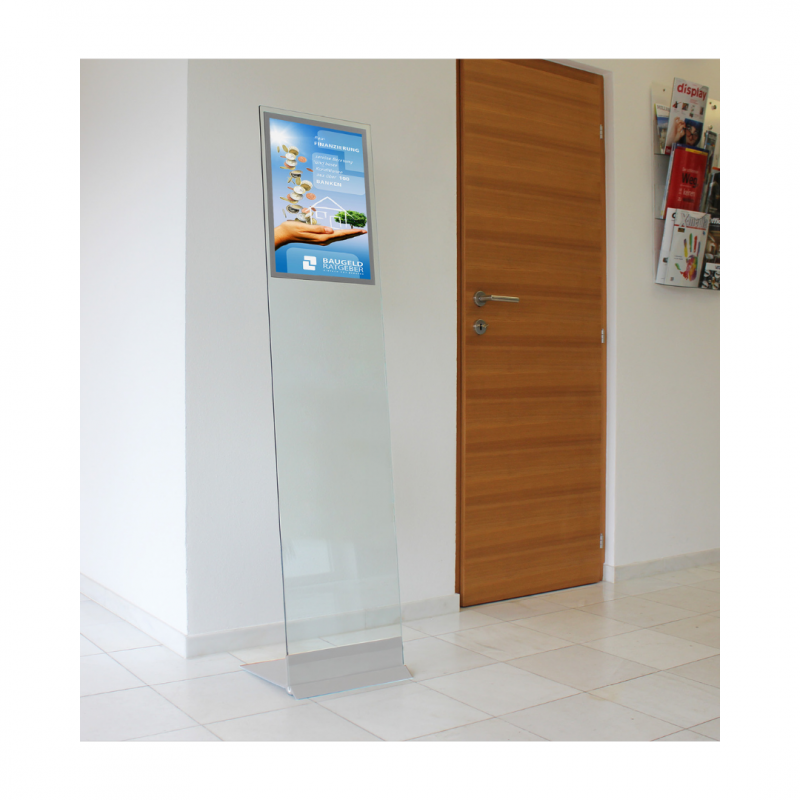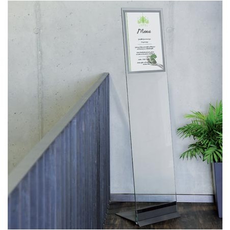 Totem signaletique en verre sur une platine en métal avec porte-affiche magnétique